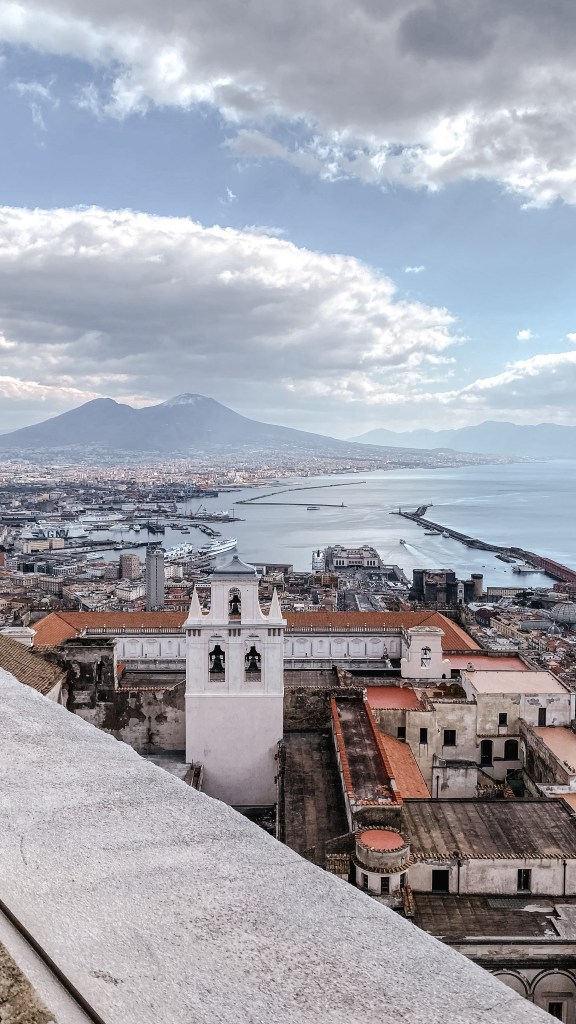 Da lassù Napoli si apre ai tuoi occhi a 360 gradi. Vedrai che riconoscerai i luoghi che hai già visitato o che visiterai: il Vesuvio si metterà in posa per te, le cupole delle basiliche faranno capolino da ogni angolo della città, le piazze, le strade, riconoscerai Spaccanapoli come quel solco nero e perfetto che arriva fino ai grattacieli del Centro Direzionale. Vedrai il mare fino all’orizzonte, la sinuosa silhouette dell’isola di Capri, il monte di Nisida, il Maschio Angioino, la Reggia di Capodimonte. Te lo prometto: ti sentirai come in capo al mondo. Il nostro piccolo mondo.